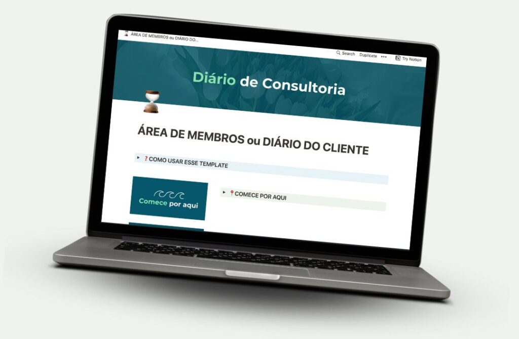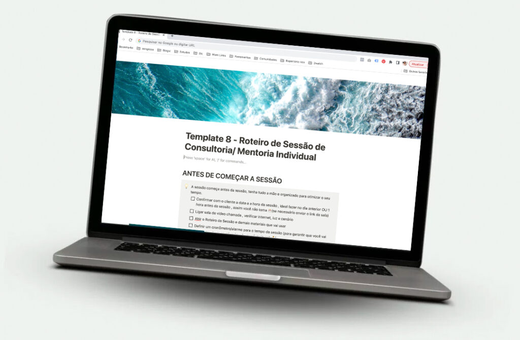 Se você presta consultoria ou mentoria, esse template é exatamente o que precisa para organizar as sessões. Lá você encontra o que fazer antes da sessão começar, o que fazer durante a sessão, como encerrar a sessão e o que fazer pós-sessão.
