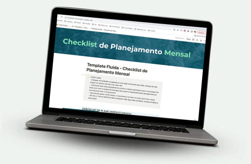 Um checklist de ações que toda empresária do conhecimento precisa para planejar o mês, com ações que você precisa fazer do tipo calcular o faturamento do mês anterior, definir o produto que vai ser foco da ação de vendas do mês e revisar o que deu certo e errado no mês anterior